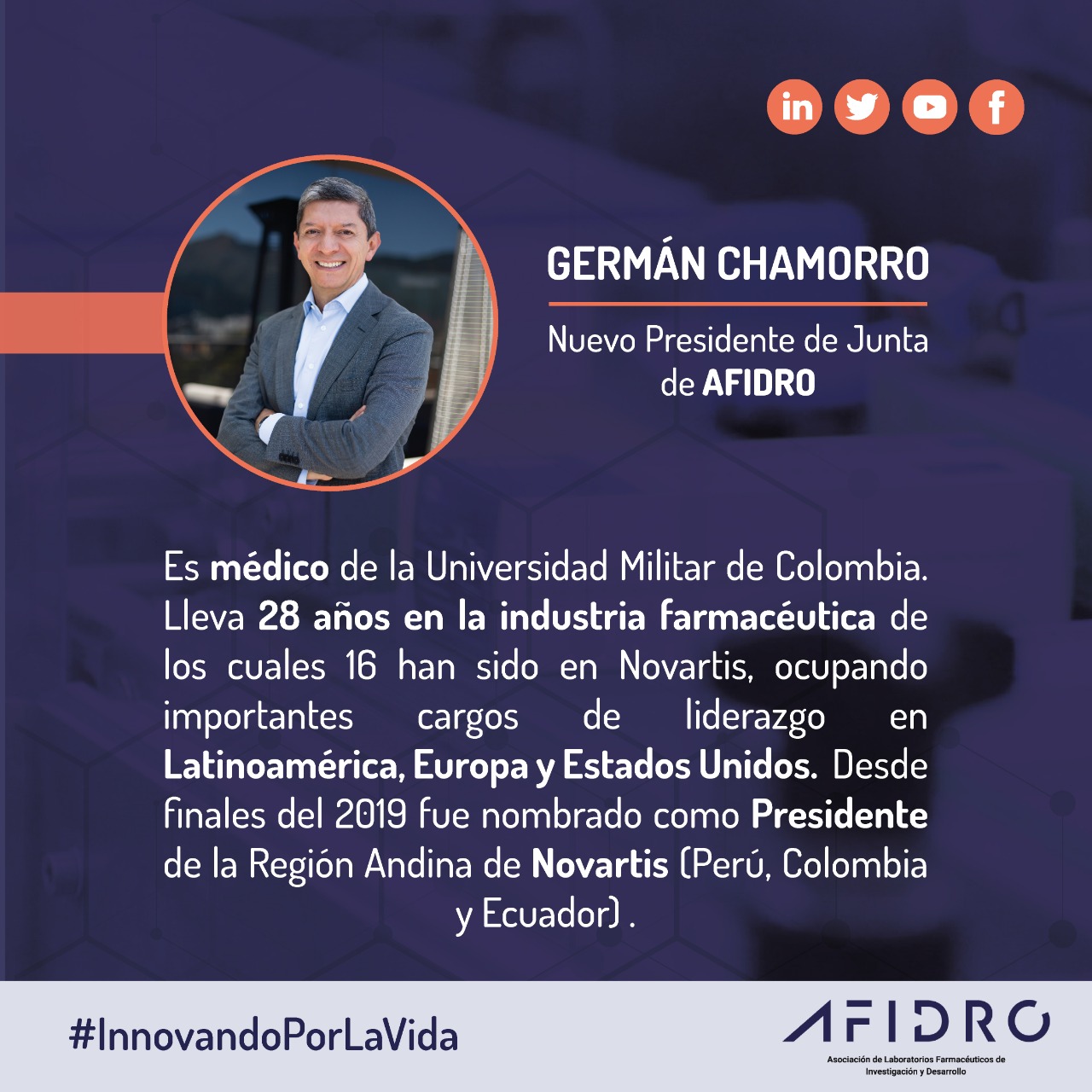 Bogotá, junio de 2020.- La Asociación de Laboratorios Farmacéuticos de Investigación y Desarrollo (Afidro) designó a Germán Chamorro, Presidente de la Región Andina de Novartis, como Presidente de la Junta Directiva del gremio.