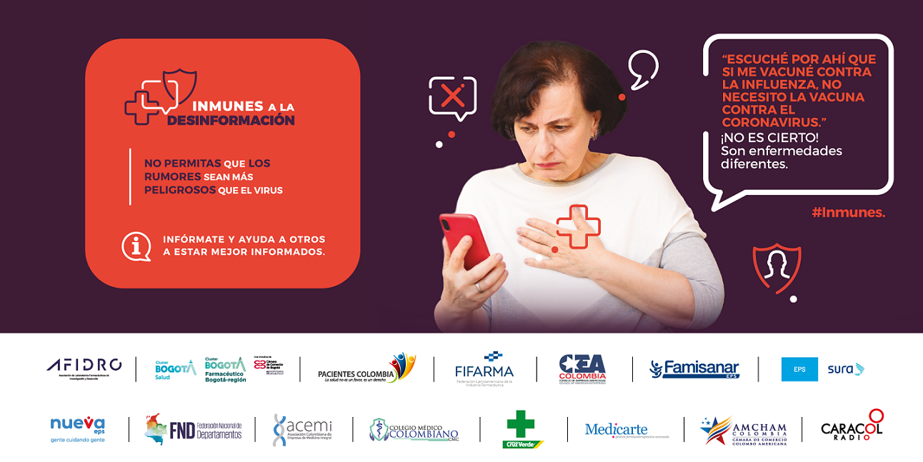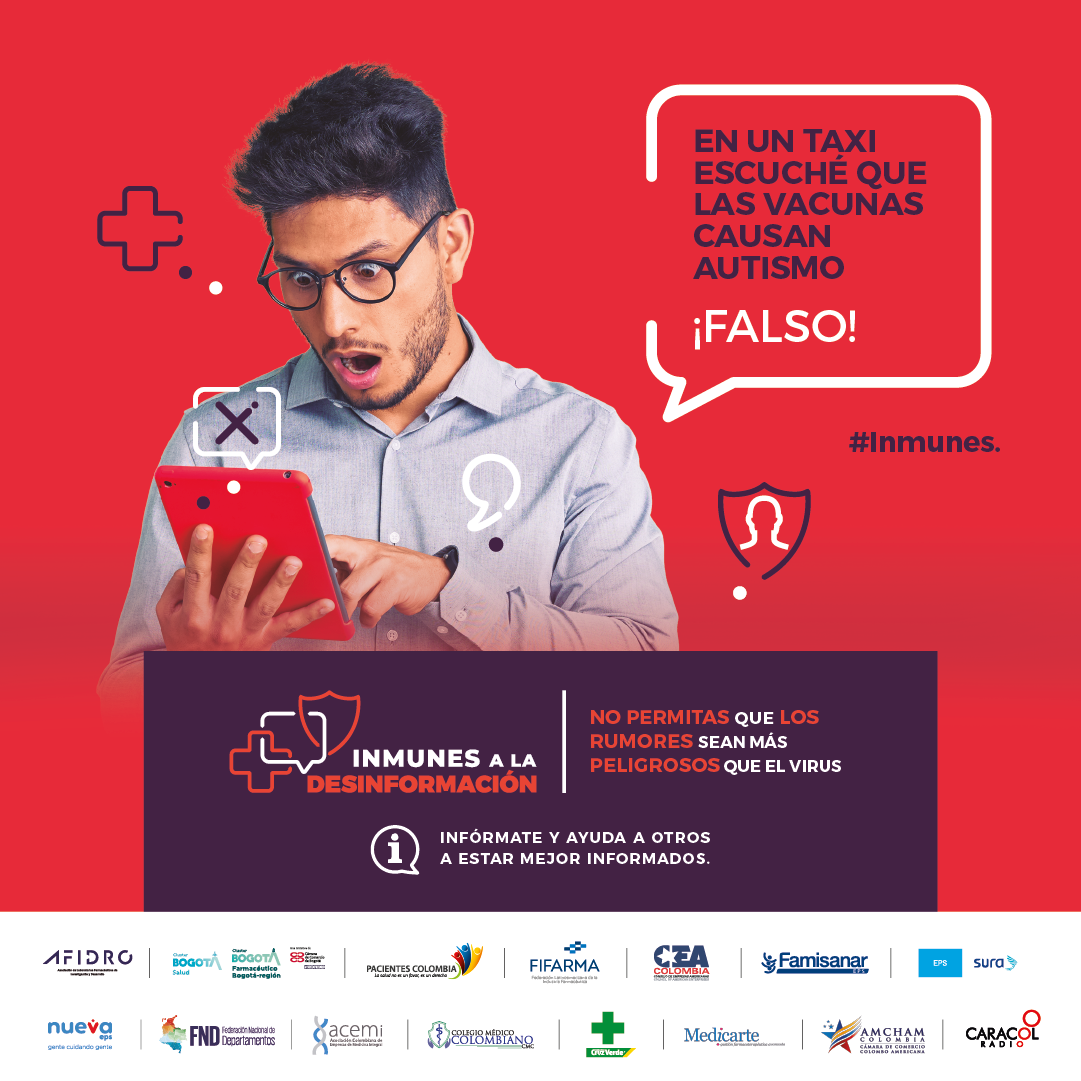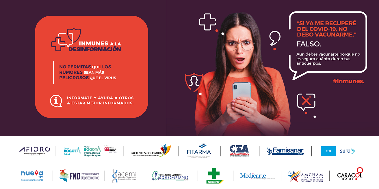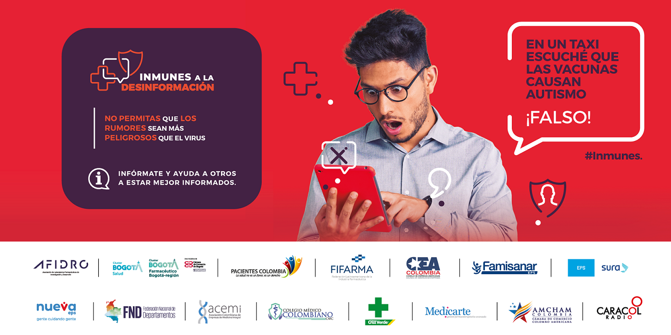 En el mundo hiper conectado de hoy los rumores, mitos y la desinformación se esparcen más rápido que un virus o una enfermedad y en ocasiones pueden ser muy peligrosos para la salud de todos. Esta es la premisa bajo la cual nace la campaña Inmunes a la desinformación que tiene como objetivo compartir con todas las audiencias información verídica sobre la investigación, desarrollo y producción de vacunas para diferentes tipos de enfermedades inmunoprevenibles y el aporte de estas innovaciones a la salud y la vida.