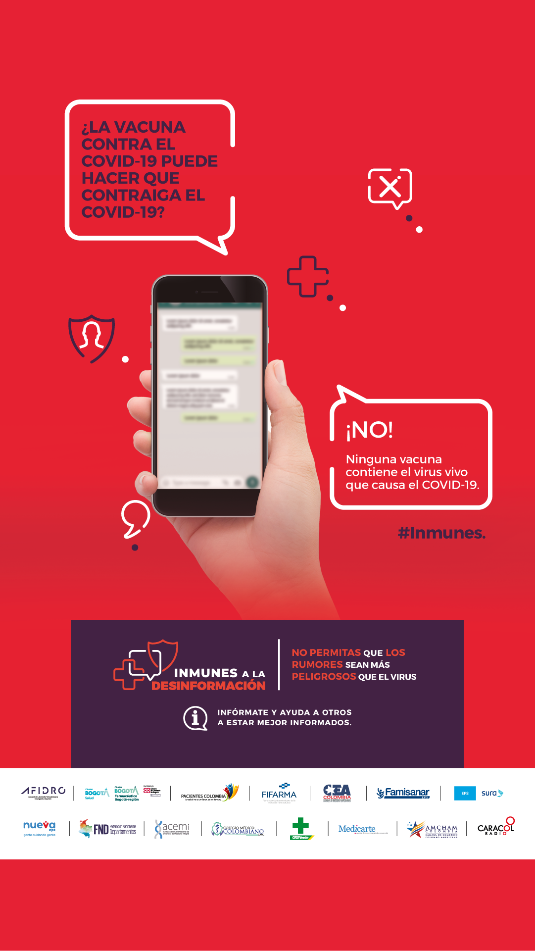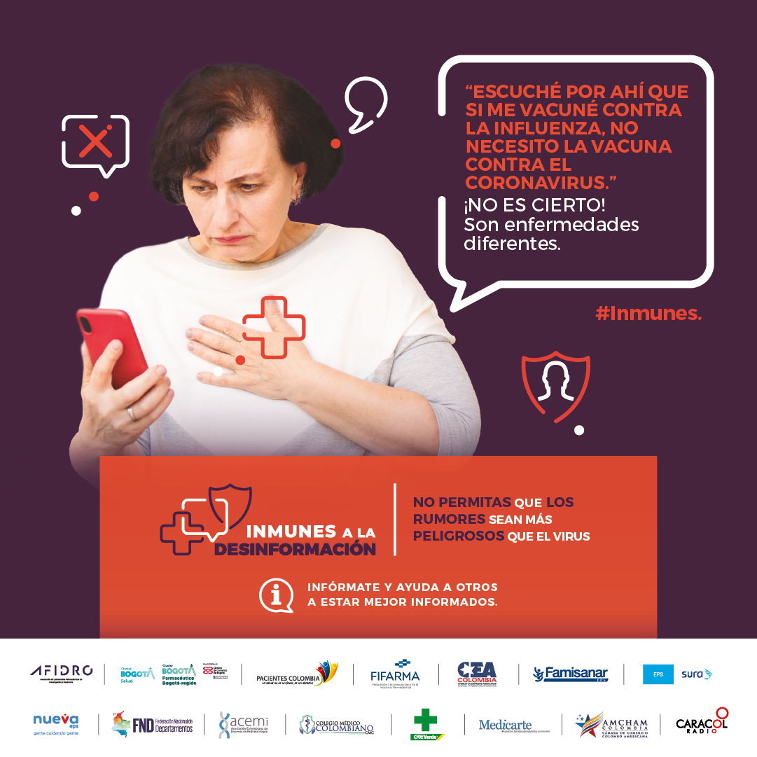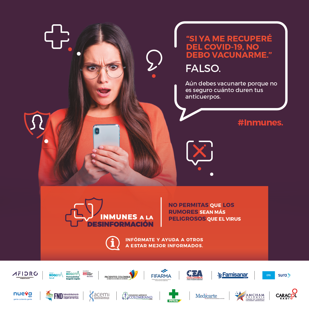 En el mundo hiper conectado de hoy los rumores, mitos y la desinformación se esparcen más rápido que un virus o una enfermedad y en ocasiones pueden ser muy peligrosos para la salud de todos. Esta es la premisa bajo la cual nace la campaña Inmunes a la desinformación que tiene como objetivo compartir con todas las audiencias información verídica sobre la investigación, desarrollo y producción de vacunas para diferentes tipos de enfermedades inmunoprevenibles y el aporte de estas innovaciones a la salud y la vida.