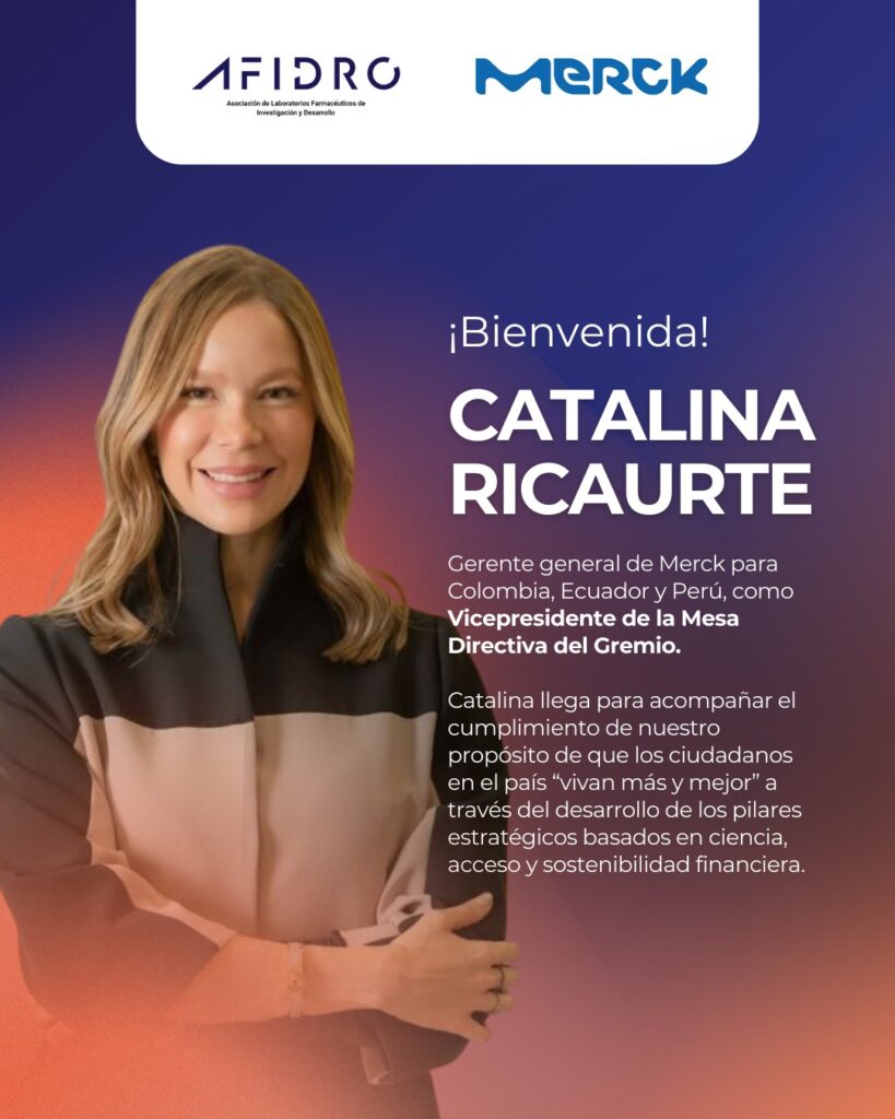La Junta Directiva de la Asociación de Laboratorios Farmacéuticos de Investigación y Desarrollo (Afidro) eligió a Catalina Ricaurte, gerente general de Merck para Colombia, Ecuador y Perú, como Vicepresidente de la Mesa Directiva del Gremio para acompañar el cumplimiento de nuestro propósito para que los ciudadanos en el país “vivan más y mejor” a través del desarrollo de los pilares estratégicos basados en ciencia, acceso y sostenibilidad financiera.